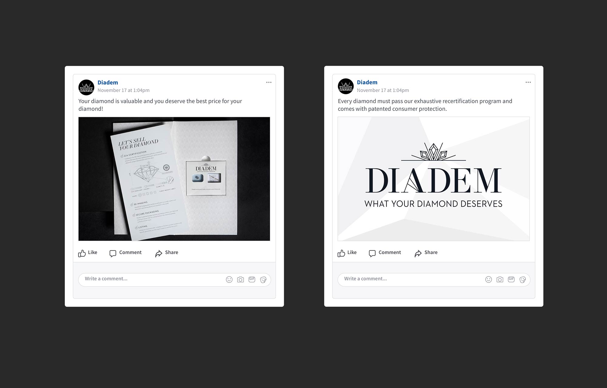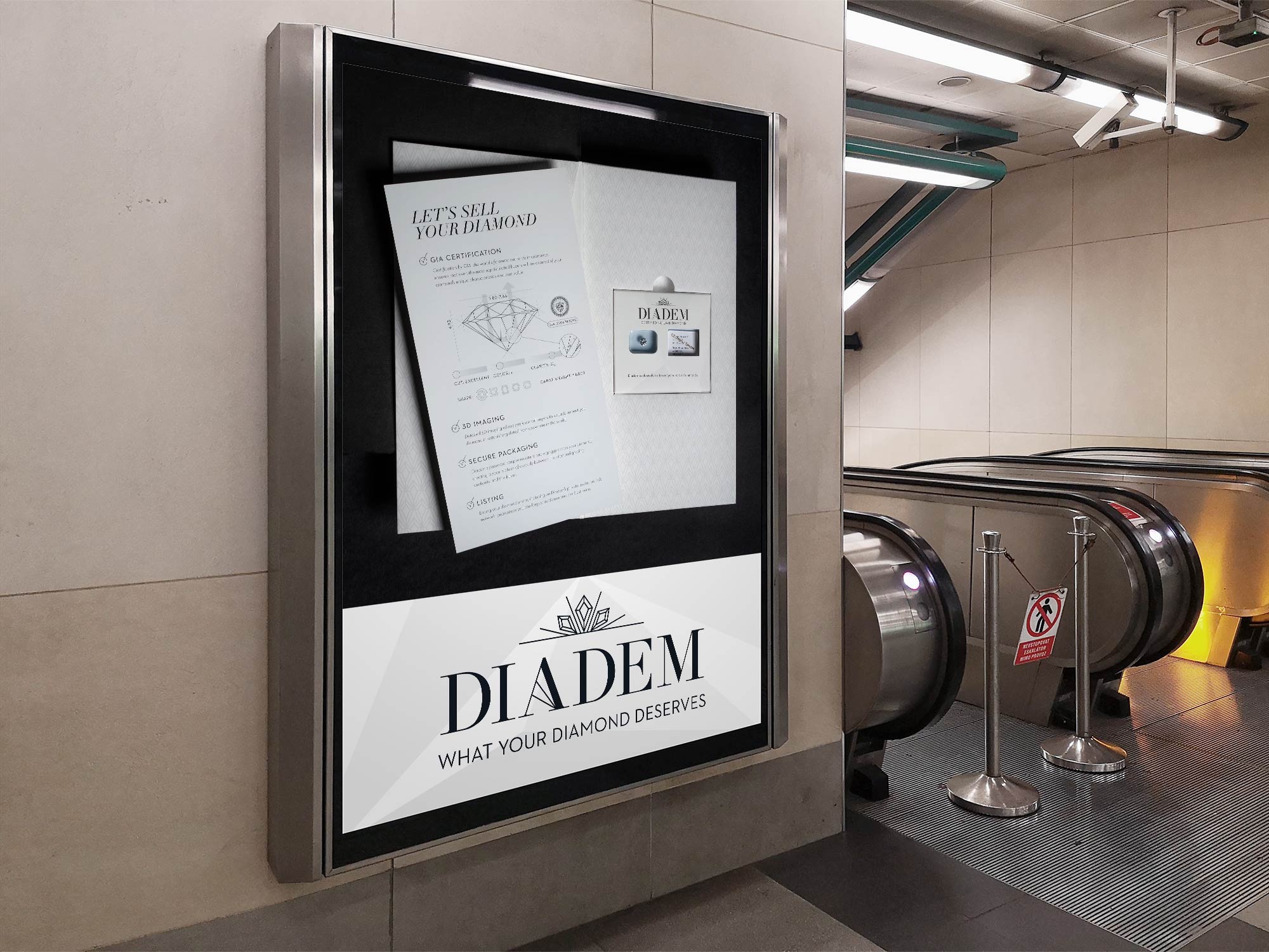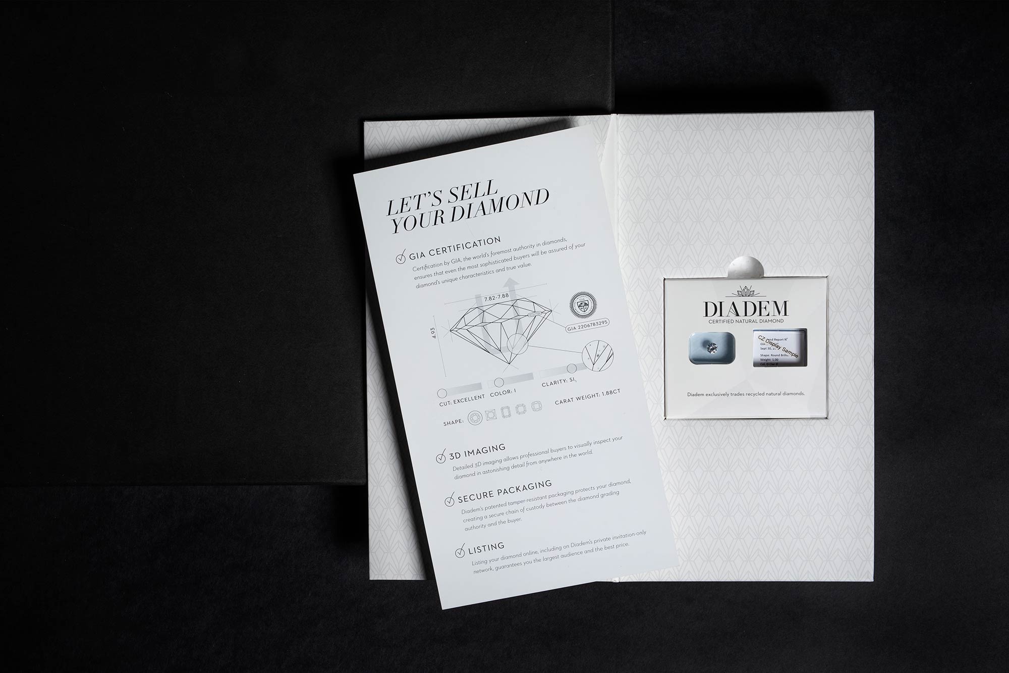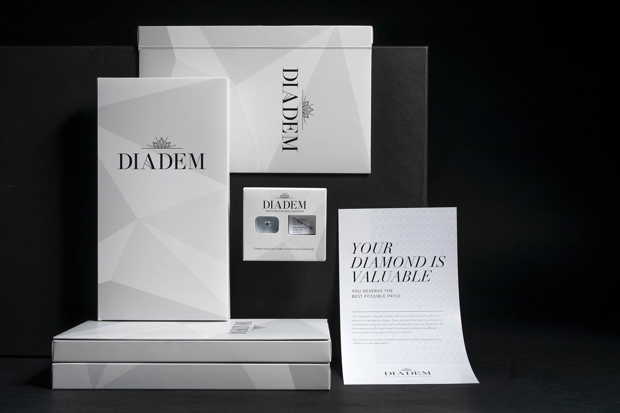 The company’s founder patented these tools and created the process, and then approached us with a startup in need of a story to tell. We named the company Diadem, which is the term for a jeweled crown or headband worn as a symbol of sovereignty, to position them as the leader. The tagline “What your diamond deserves” speaks to the value of your diamond as well as the care and treatment given to the consumer by the company. We also created an elegant visual identity that could be applied to all aspects of communication and designed the patented packaging.
