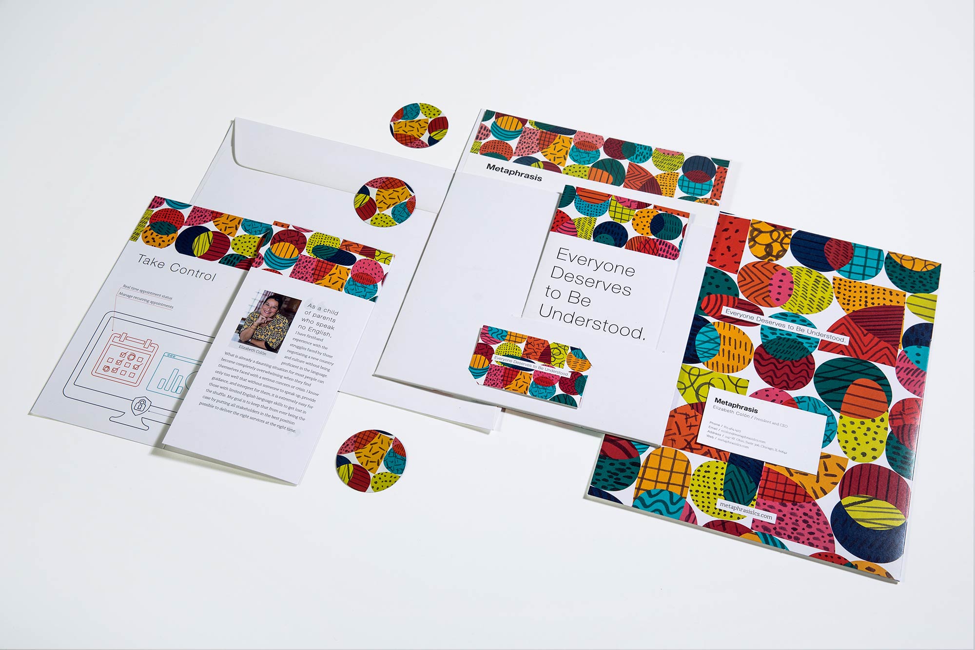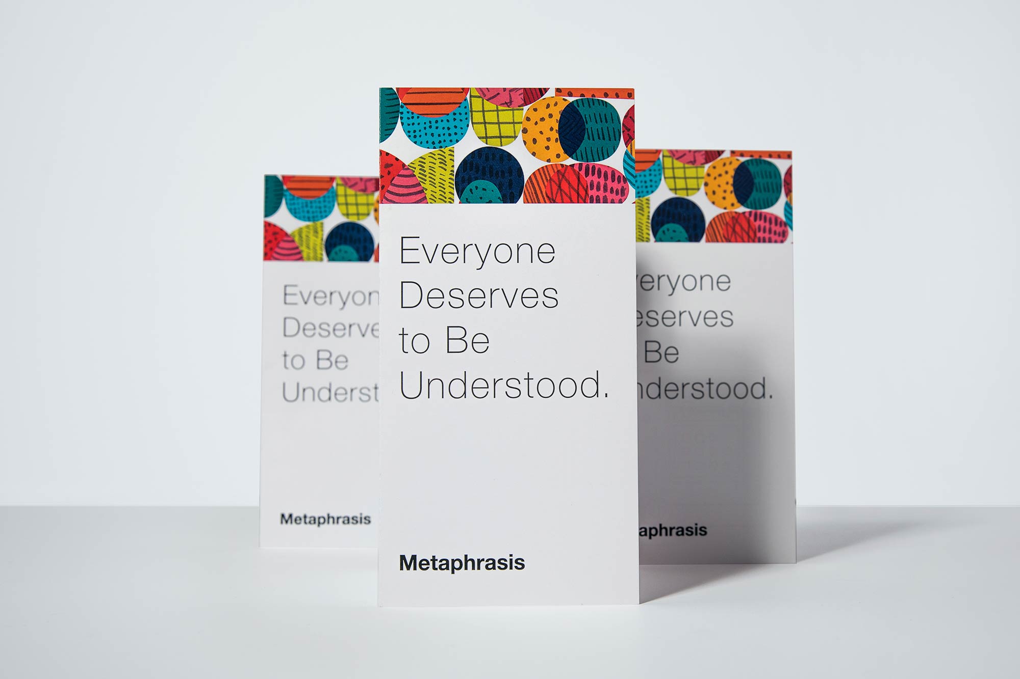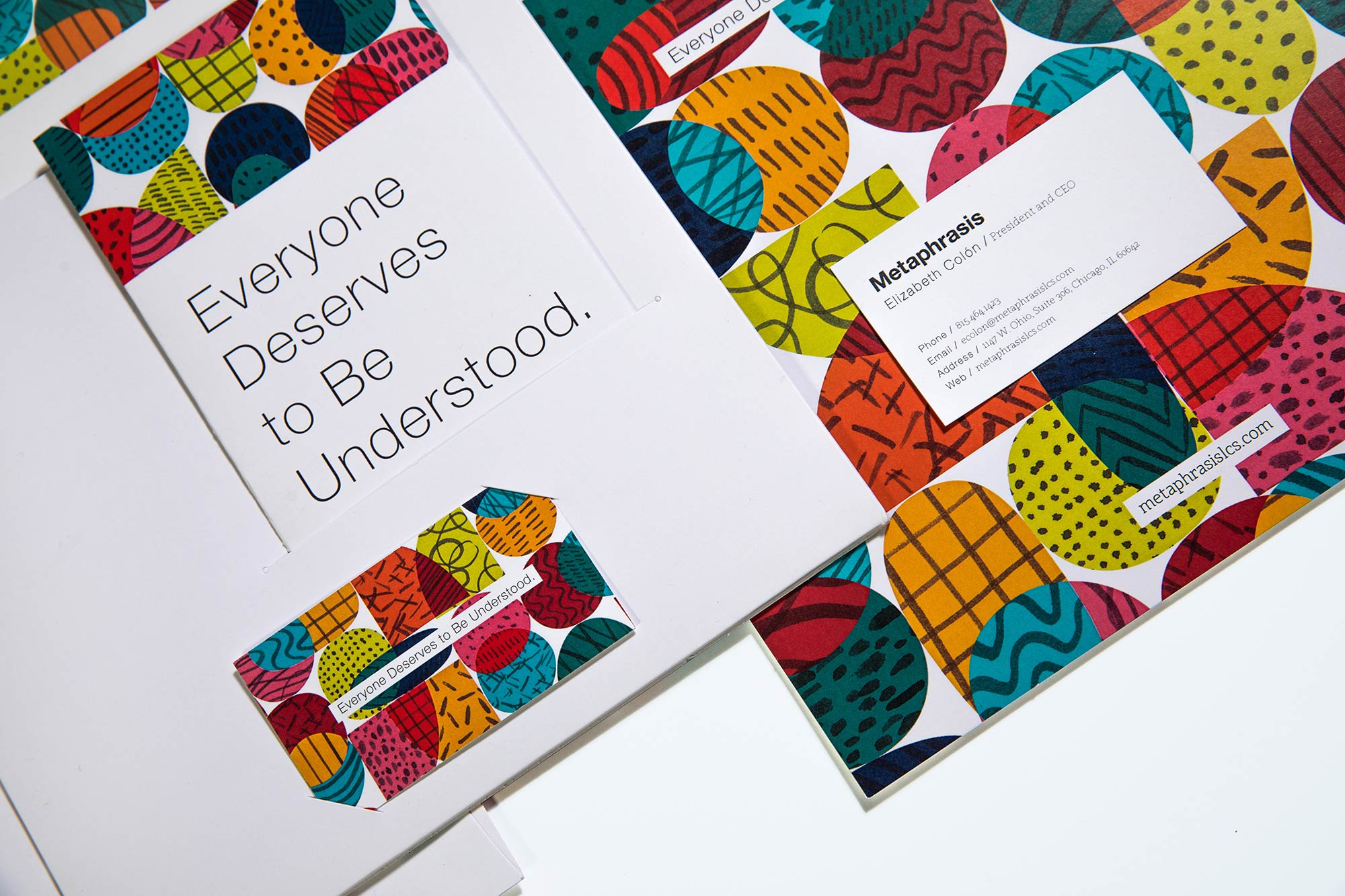 We developed a brand strategy that included the tagline “Everyone deserves to be understood.” This worked hand in hand with the visual identity to communicate that Metaphrasis translators and interpreters speak and understand a wide range of languages from an array of cultures—a diversity reflected in our custom pattern, which draws influences from many vibrant textiles specific to cultures around the world. Our complete marketing and sales collateral system included brochures, business cards, and folders. We also developed social media graphics and ads. We equipped the team with an impactful narrative and identity unlike any other in the category.